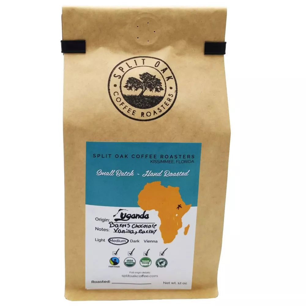 Organic Uganda Roasted Coffee Beans 12oz. A rare gem among specialty coffees! Tasting notes: Baker's chocolate, vanilla and syrup. Very low acidity Location: Sipi Falls area of Mount Elgon, on an extinct shield volcano that lies on the border of Uganda and Kenya. The Sipi Falls area is particularly famous for locally grown Bugisu Arabica coffee. Bugisu Arabica only grows at an altitude of between 1,600 and 1,900 metres. Drying: Sun-dried on raised beds. A natural, simple, intuitive and affordable process to choose the best beans, it requires no water, no artificial energy sources and generates almost no waste. Highlights: Certified Organic, Rainforest Alliance (RFA) approved, and UTZ certified. Fully Washed, shade grown, and hand picked. This Arabica Coffee is grown in north Uganda near Sipi Falls. The Uganda Whole Beans from Split Oak Coffee Roasters is distinguished by its clean flavor and distinctive aroma. Some of the best coffees in the world grows on Uganda's Mt. Elgon. A good brewed cup of Split Oak Uganda Coffee exibits the desirably winey acidity of a fine coffee.