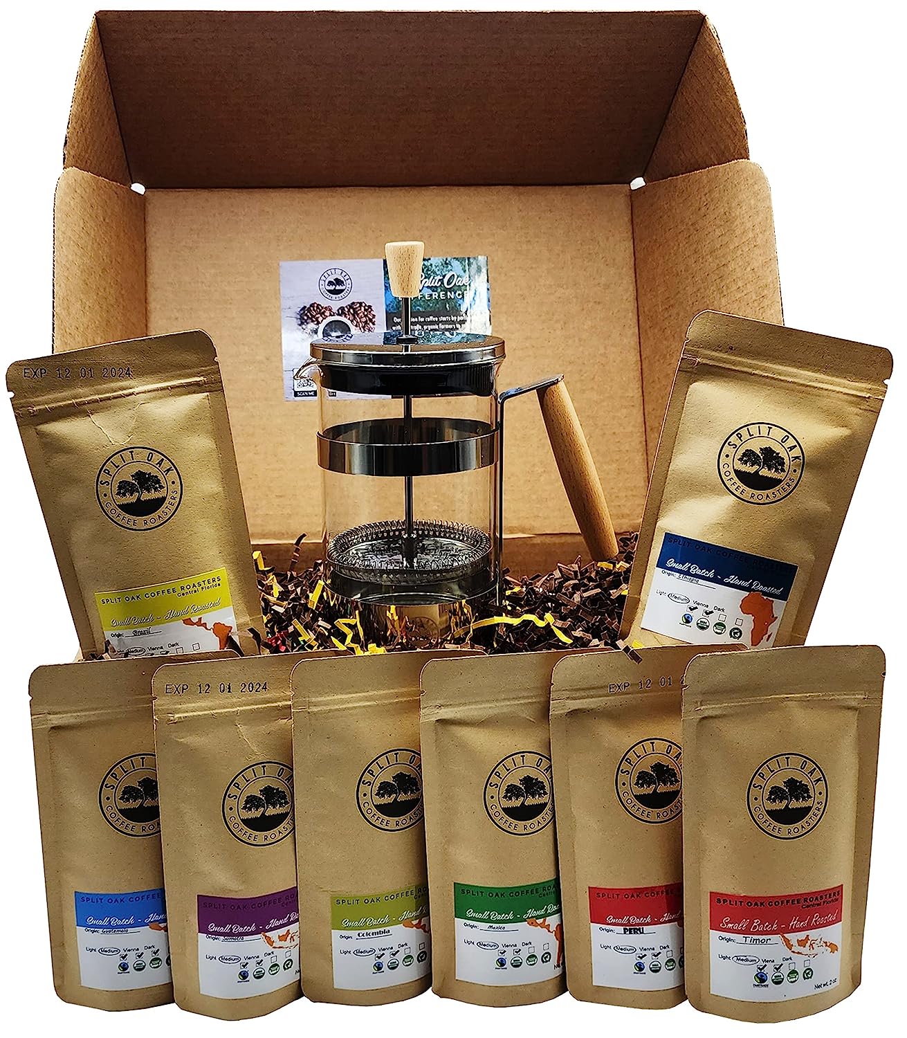 Coffee Gift Box Set 8 Assorted Coffees 2oz plus1 French Press Stainless Steel Glass Coffee Maker. Amazing coffees from all over the world